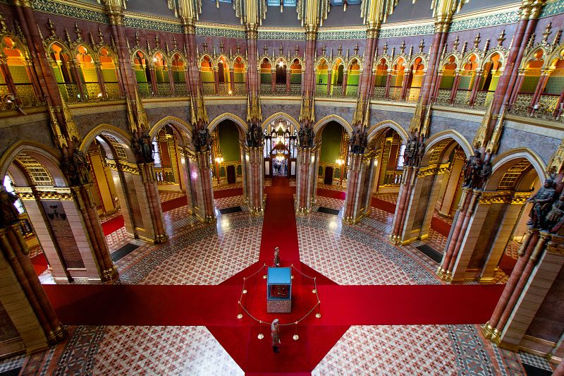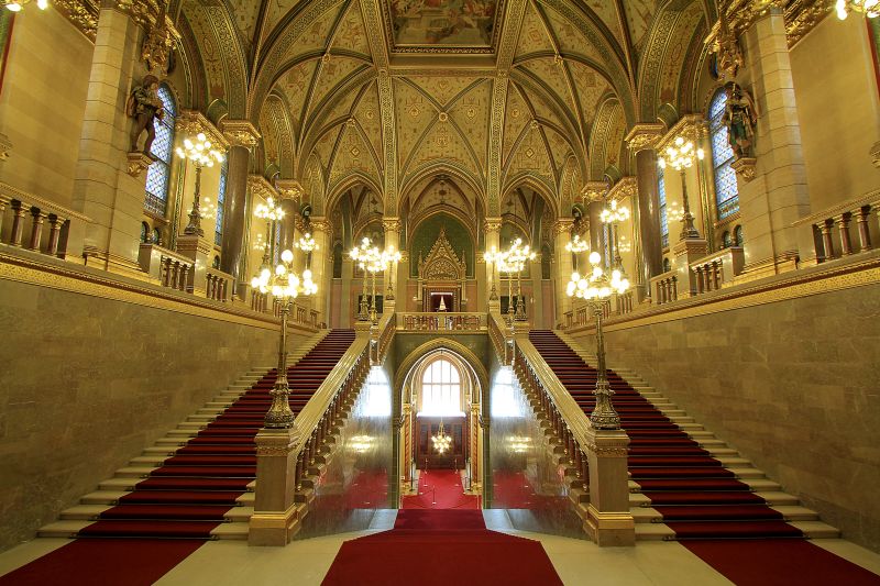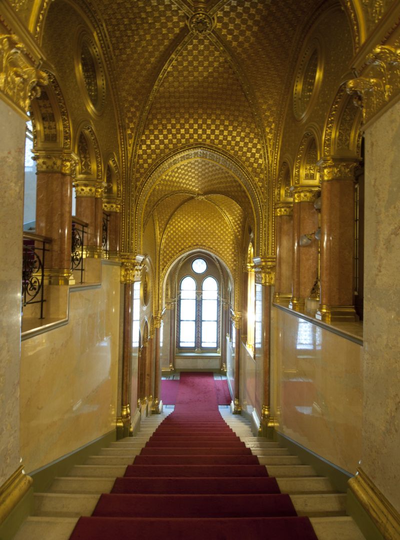 Díszlépcsőház lépcsőiA látogatás az Országház egyik ékkövének tartott helyiségében, a díszlépcsőházban folytatódik. A teret uraló, vörös színű szőnyeggel borított, 96 fokból álló lépcsősor a főbejárattól a kupolacsarnokig vezet. A főlépcsőház mennyezetén Lotz Károly festőművész két nagyobb és egy kisebb alkotása vehető szemügyre. A helyiség ékessége a nyolc darab, egyenként négy tonna súlyú gránitoszlop, amelyből összesen 12 darab található a világon. A teret két oldalról szegélyező díszes üvegablakok Róth Miksa műhelyének remekei.